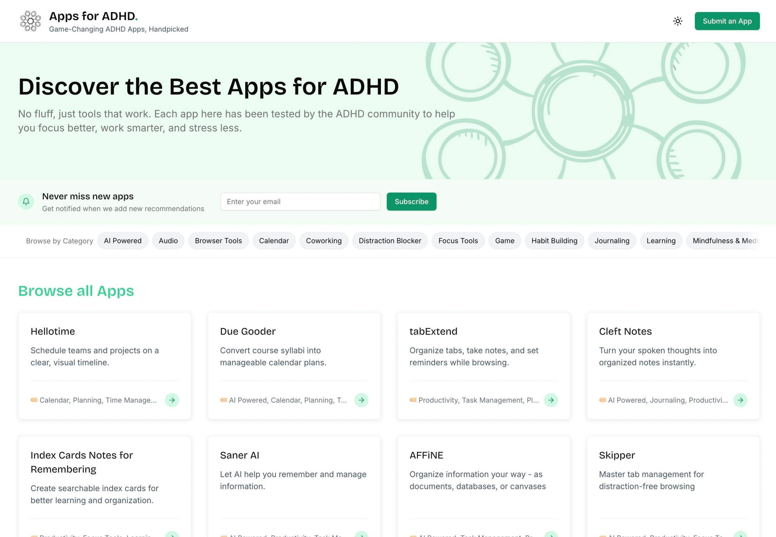 Apps for ADHD, inaugurated in November 2024, is an innovative, free online platform designed specifically to assist individuals with ADHD in enhancing their productivity, organization, and focus.