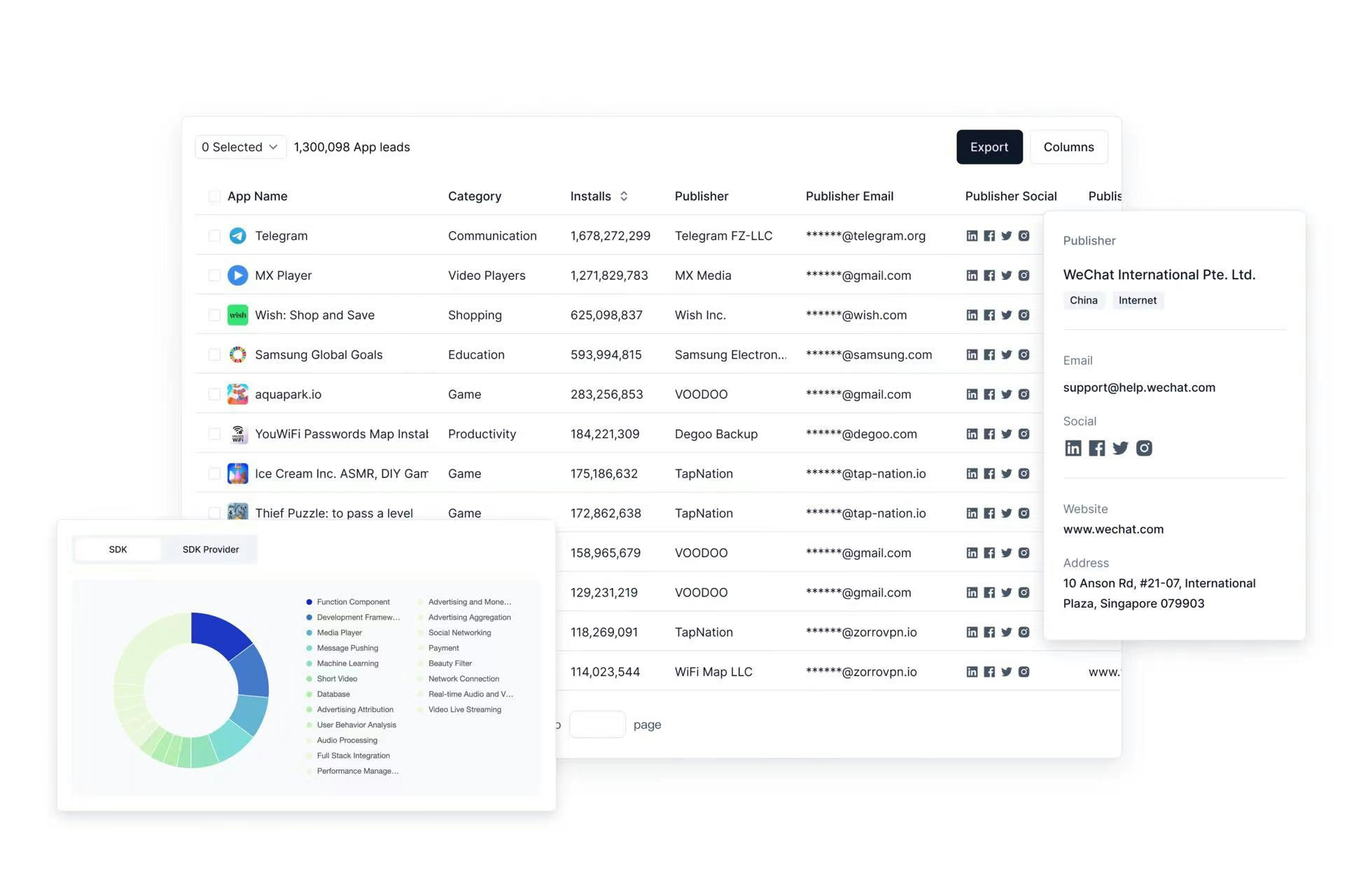 Key capabilities include the ability to search for apps based on specific technology usage, which allows users to understand market trends and software preferences.