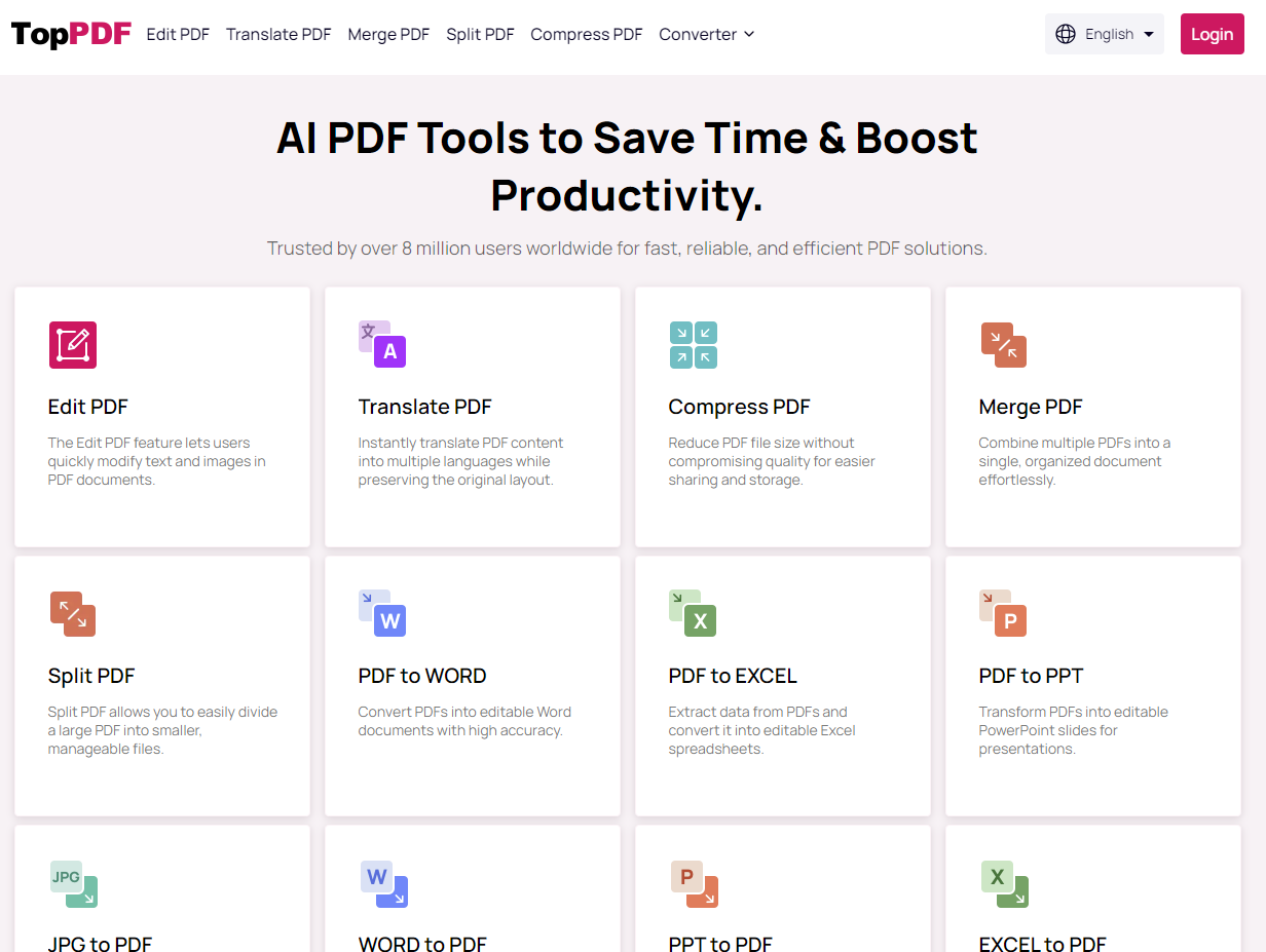Whether you need to edit PDFs to modify text or images, compress them to reduce file size without losing quality, translate documents instantly to bridge language gaps, or convert PDFs to and from different formats like Word, Excel, or JPEG, TopPDF has you covered.