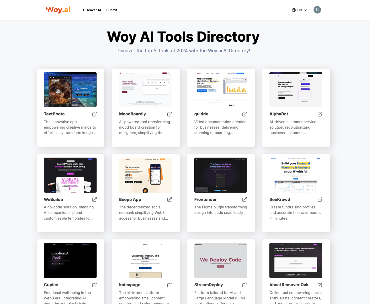 Woy AI Directory is a comprehensive platform designed to help users discover and explore the latest and best AI tools of 2024. The directory provides a curated list of AI-powered tools across various domains, including content creation, marketing, financial management, and more. Each tool is described in detail, highlighting its features and applications. Whether you’re a developer, marketer, or AI enthusiast, Woy AI offers a valuable resource for finding innovative AI solutions to enhance your projects and workflows.